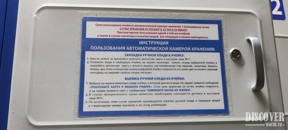 To remove things, select your cell number on the display, then attach a magnetic card, the door will open. If you have stored things for more than a day, then before opening the cell you need to pay the price difference in ticket office number 11. The maximum storage period is 7 days.