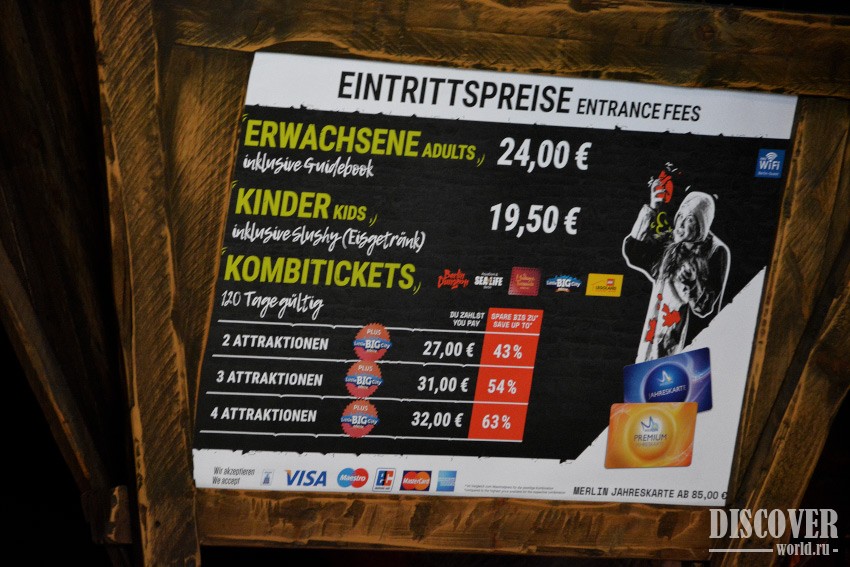 Some scenes: lady ghost, torture chamber, riding on a raft, labyrinth and at the very end - the attraction "elevator EXITUS", where there will be a fall from a height of 12 meters. The attraction "elevator EXITUS" has a number of restrictions: