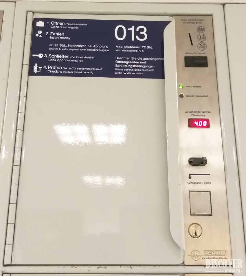 - Pay with coins required amount for the first 24 hours (if you need more time - additional payment will be made when you return to pick up luggage, maximum 72hr). Accepted coins: 1 euro, 2 euro, 50 cents.