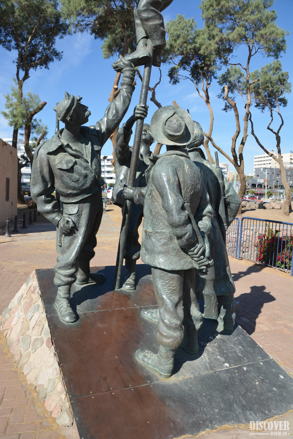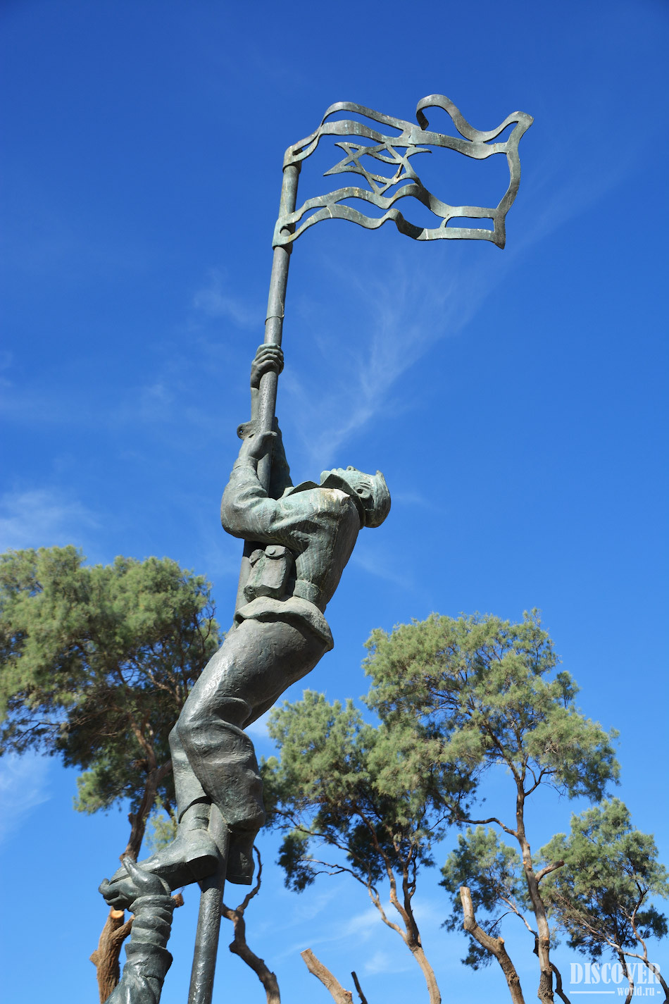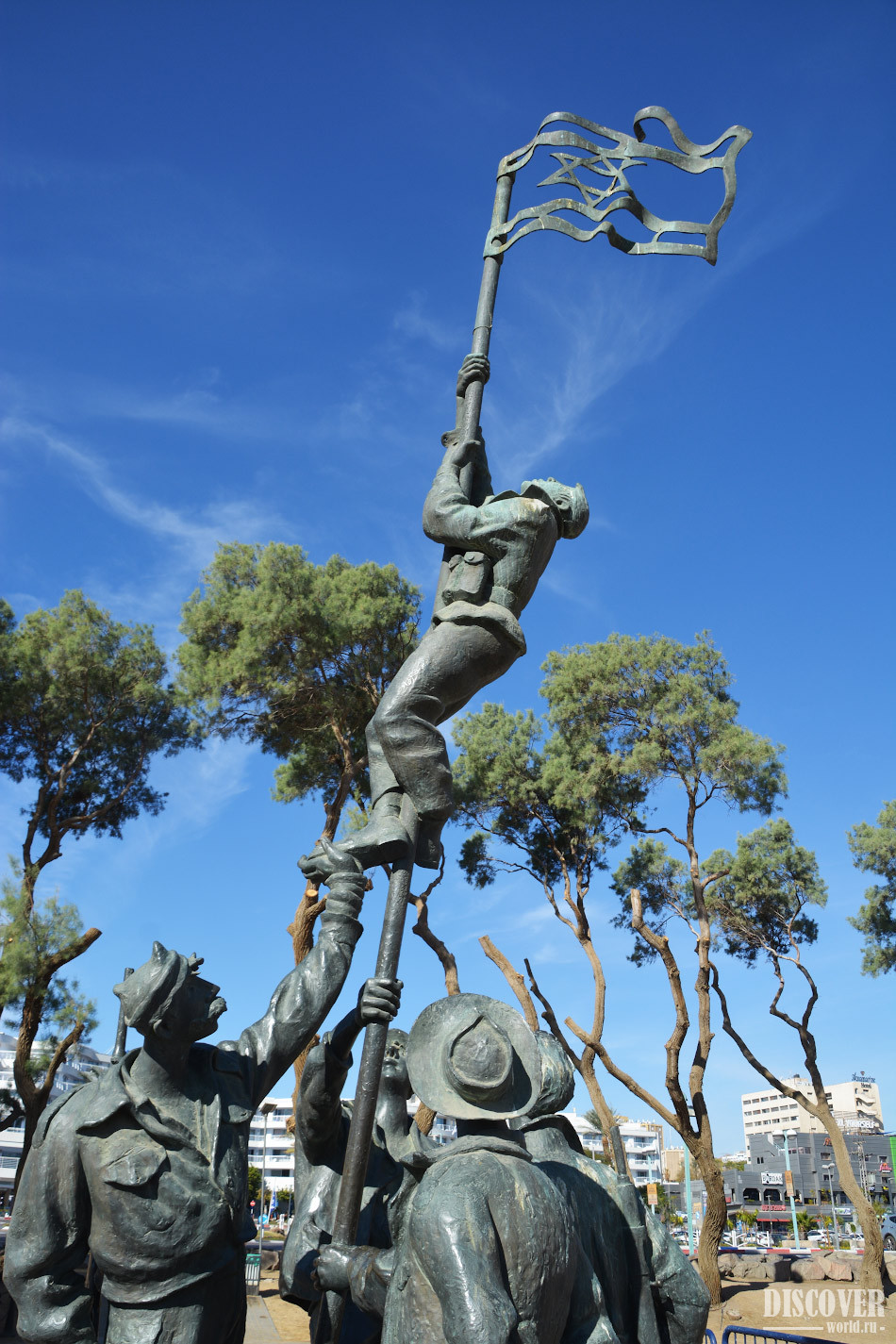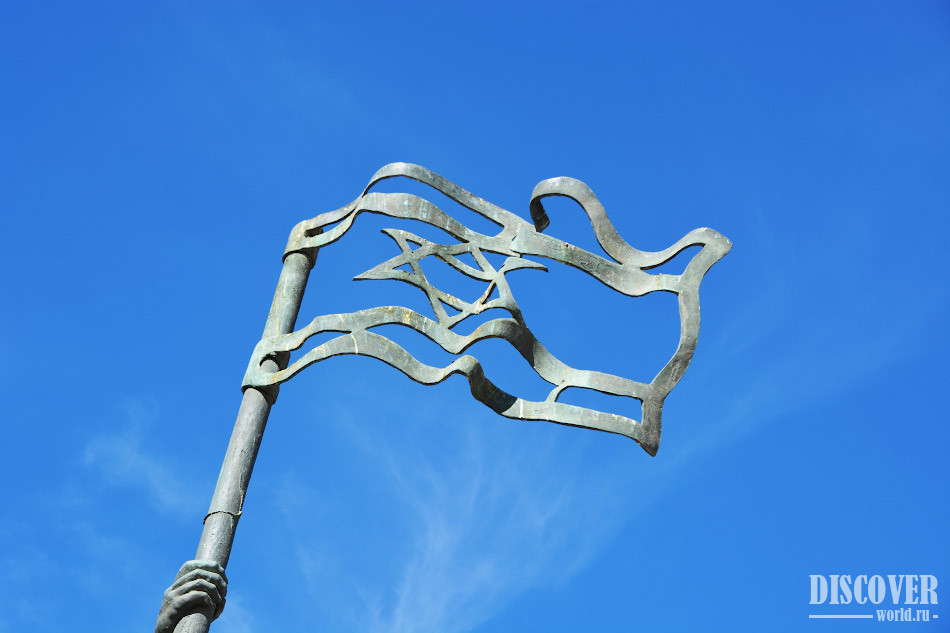The sculptural composition depicts a group of people setting the flag of Israel. The author of the sculpture depicted people exactly as it was captured in a historical photograph.