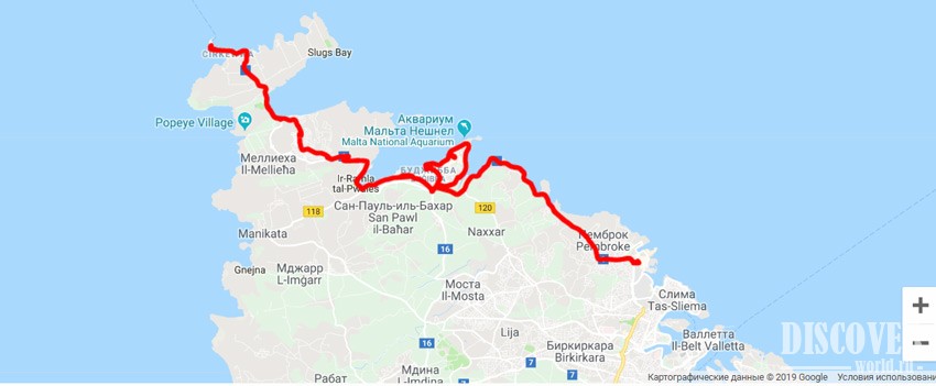 Full route: St. Julian’s / San Giljan / Is-Swieqi / Pembroke / Bahar ic-Caghaq / Il-Qawra / Bugibba / Il-Qawra / Bugibba / San Pawl il-Bahar / Ix-Xemxija / Il-Mellieha / Il-Marfa / Ic-Cirkewwa