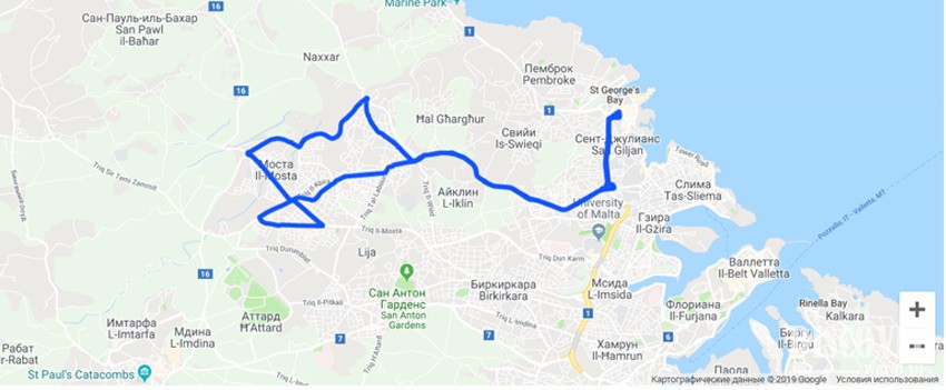 Full route: St. Julian’s / San Giljan / Il-Kappara / San Gwann / In-Naxxar / Il-Mosta (circular route, returns back to St. Julian / San GIljan)