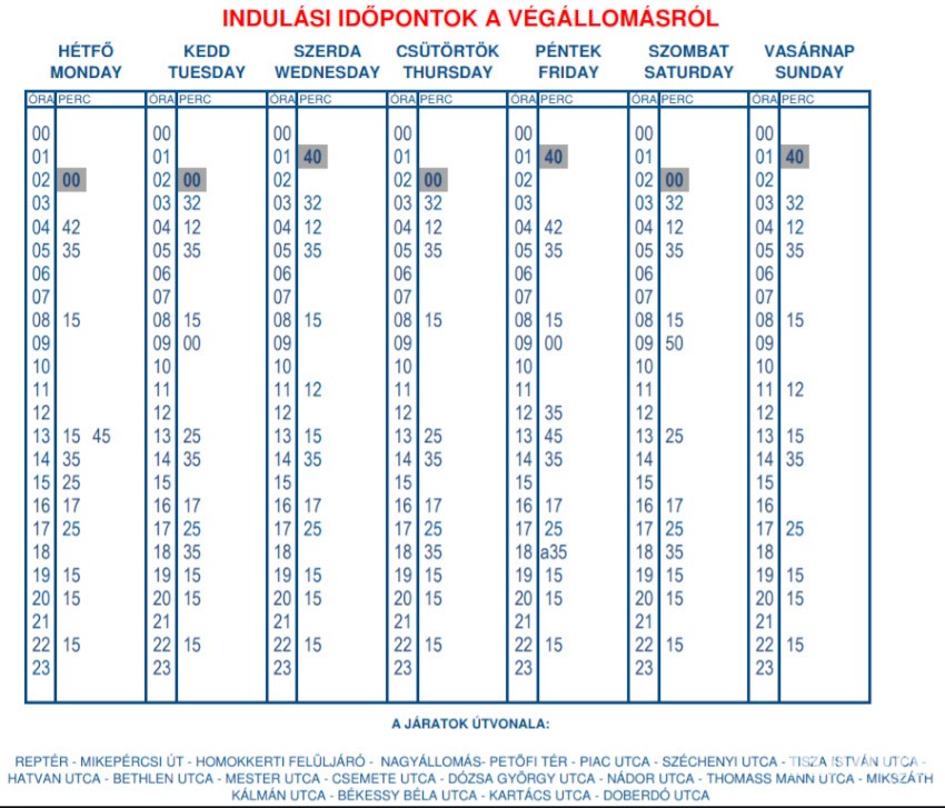 Tā kā šie autobusi kursē diezgan reti, mēs iesakām braukt ar pirmo autobusu, kas piebrauks pie pieturas. Ja jums ir nepieciešams tālāk uz centru, tad no Nagyállomás līdz centram var pastaigāties ar kājām vai iegādāties biļeti uz jebkuru citu transportu (piemēram, tramvaju), kas brauc daudz biežāk.