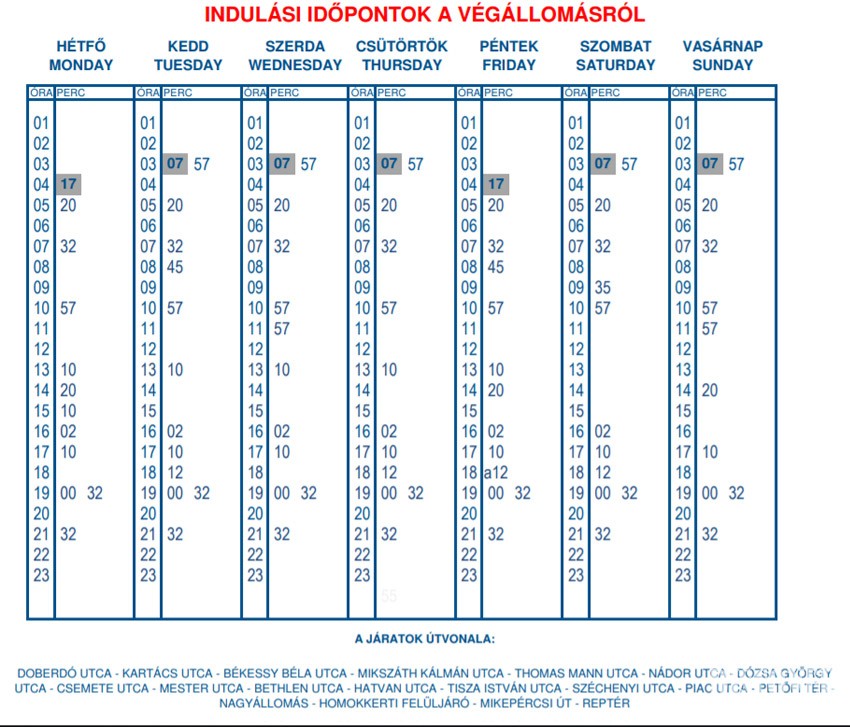 No Debrecenas līdz lidostai tiek parādīts autobusu atiešanas laiki no galapunktiem, autobusam Airport 1 tas ir Nagyállomás, Airport 2 tas ir Doberdó utca. Saite uz failu ar sarakstiem.