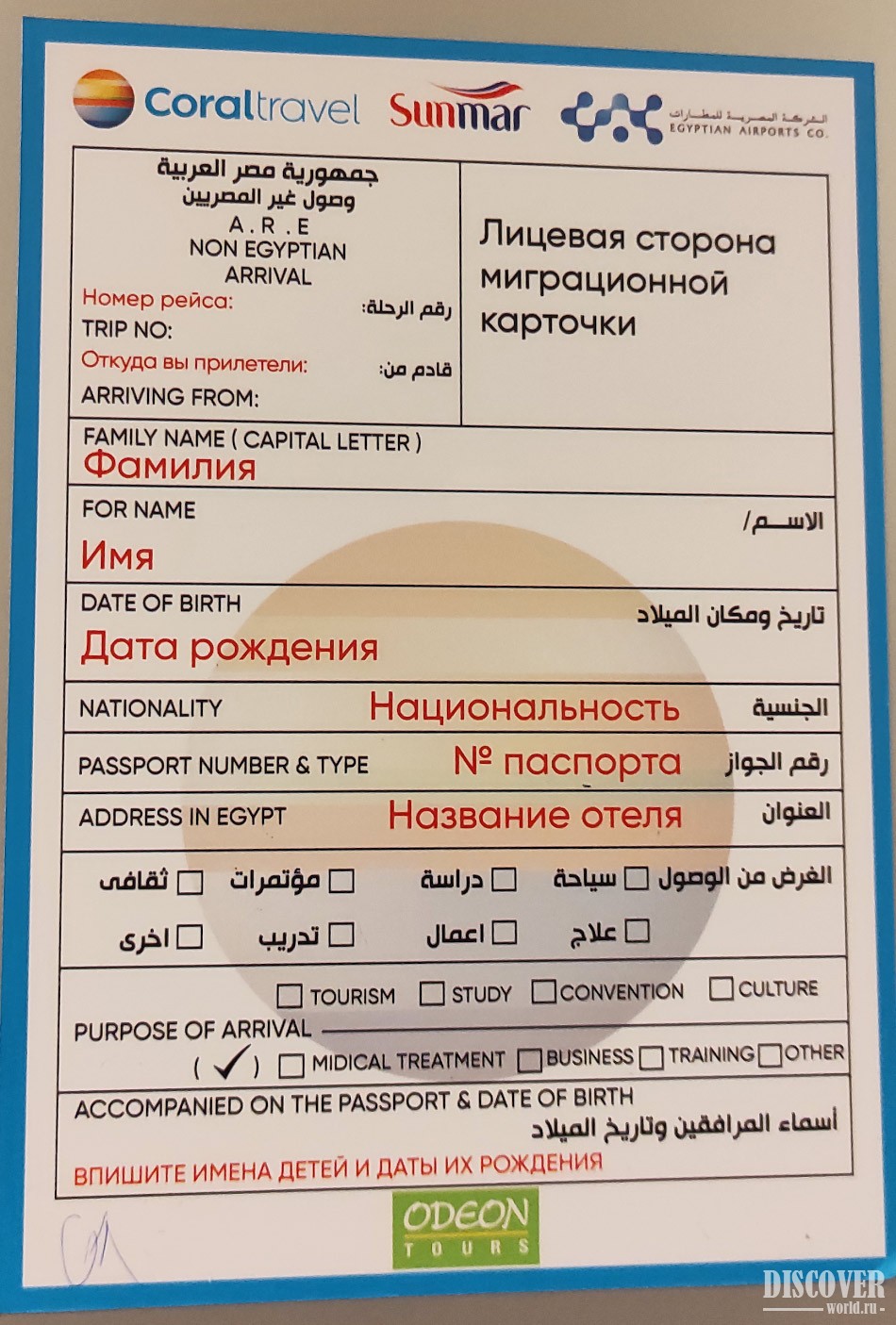 Пример миграционной карты Египта, которую туристы заполняют при въезде в страну: