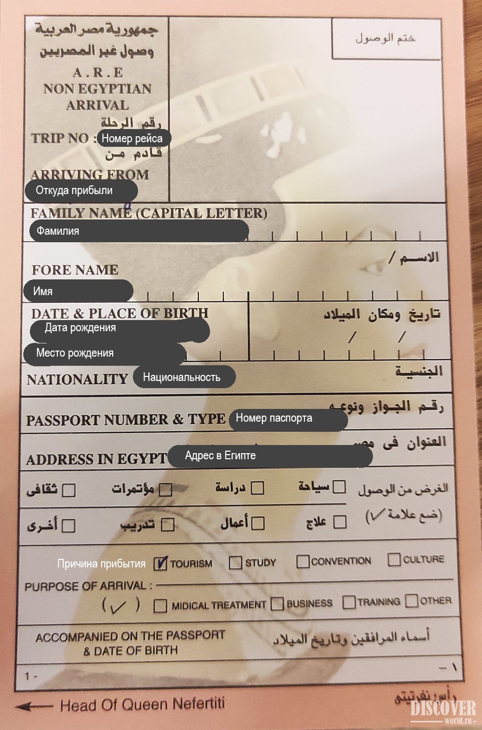 - Purpose of arrival - причина вашего визита (выше ряды по-арабски это то же самое, отмечаем галочкой нужный пункт где английский текст, варианты: tourism - туризм, study - учеба, convention - конвенция, culture - культура, medical treatment - лечение, business - бизнес, training - повышение квалификации, other- другое