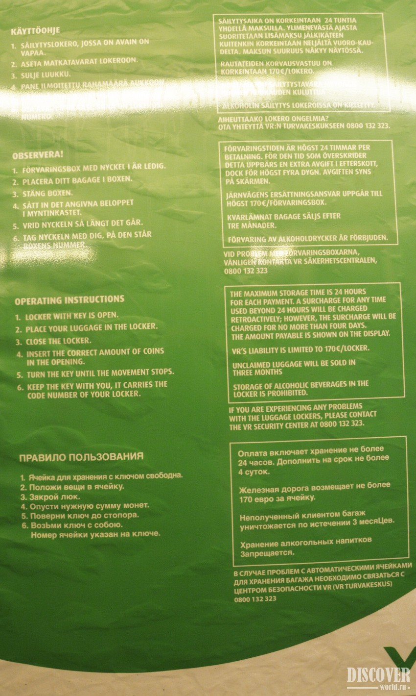 На центральном железнодорожном вокзале в Хельсинки есть камера хранения. Это очень удобно, если у вас не много времени на осмотр города и вы при этом не хотите носить все вещи с собой.