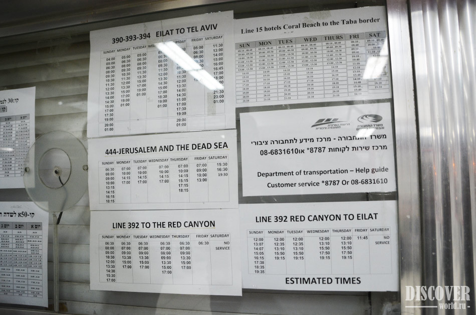 От автовокзала отходят как местные маршруты по Эйлату и окрестностям, так и междугородние рейсы по всему Израилю (например, в Иерусалим). На длинные поездки билеты лучше заказывать заранее, чтобы быть уверенным что будет свободное место в автобусе.