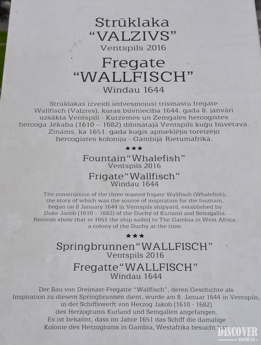 5 августа 2016 года на Большой площади открылся новый уникальный объект городского дизайна - фонтан "Fregate Valzivs" (в переводе - Фрегат Кит). На строительство фонтана такой необычной формы вдохновил реально существующий трехмачтовый фрегат "Wallfish", строительство которого было начато 6 января 1644 года на верфи в Вентспилсе (Курземском и Земгальском герцогстве). Известно, что позднее этот фрегат посетил колонию герцогства в Африке.