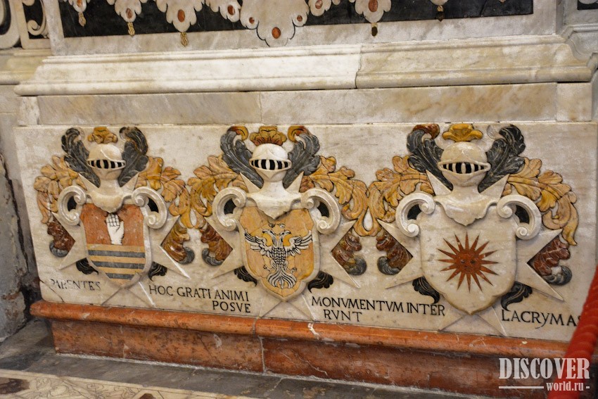 Одним из самых популярных символов является изображение смерти, представленное в виде скелета, часто с серпом и песочными часами, означающими переход времен. Другим популярным символом является ангел славы, часто представляющий дуновение трубы, отмечающий почетную репутацию умершего. Короны указывают на самых знатных рыцарей. Упомянутые символы сопровождаются бронированными щитами и оружием, начиная от боевых флагов и заканчивая алебардами, шлемами и кирасами. Каждая надгробная плита была сделана по оригинальному проекту и состоит из цветного инкрустированного мрамора. Плиты относятся к периоду с начала семнадцатого века до конца восемнадцатого века.