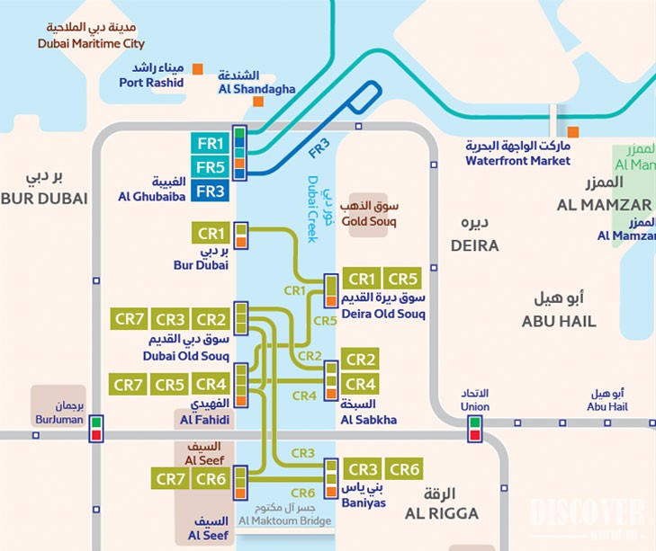 - От станции Бур Дубай Абра до станции Дейра Старый Сук Абра и наоборот (Bur Dubai Abra Station - Deira Old Souq Abra Station ).