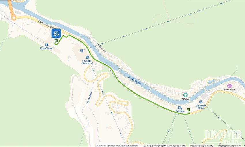 Маршрут автобуса (Вокзал Роза Хутор - Курорт Роза Хутор) показан на карте ниже: