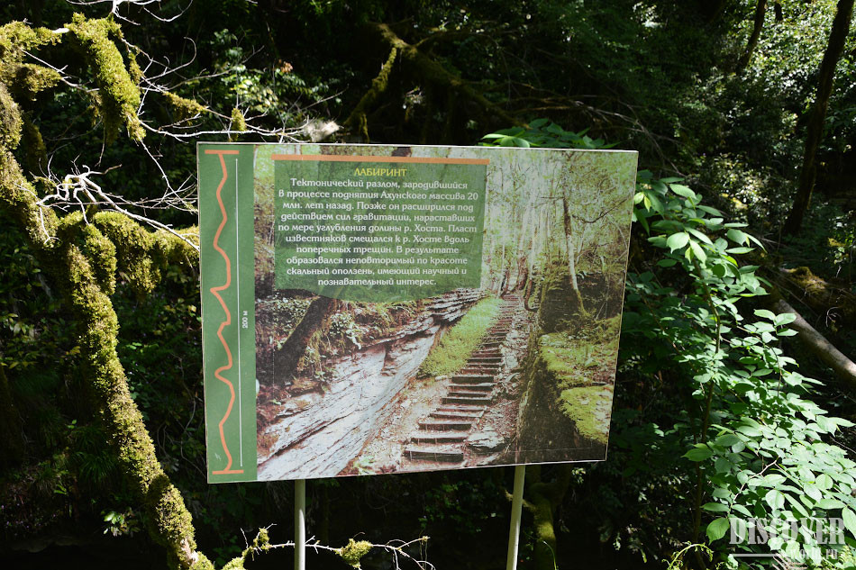 Лабиринт в Тисо-самшитовой роще - это тектонический разлом возрастом приблизительно 20 миллионов лет. Пласт известняка перемещался по направлению к реке Хоста, в результате чего образовался красивый скальный оползень. Это место сейчас и зовется Лабиринтом.