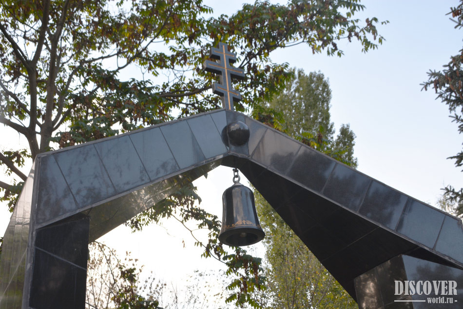 Сверху скульптуры подвешен черный колокол, еще чуть выше расположен православный крест.