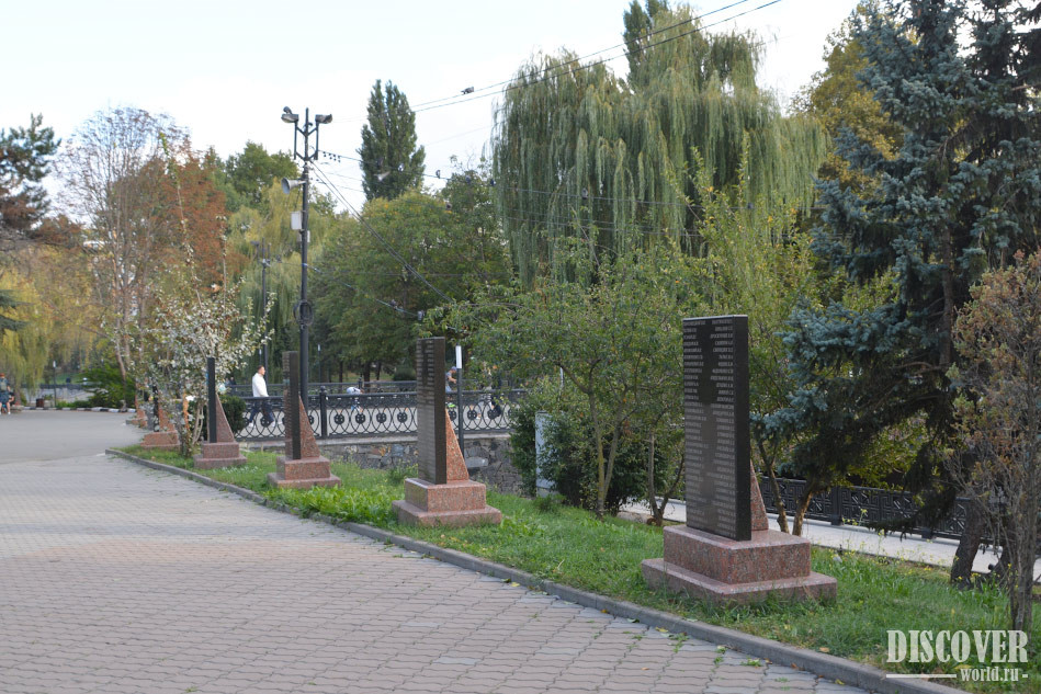 Рядом с памятником есть аллея с мемориальными плитами с перечнем имен погибших.