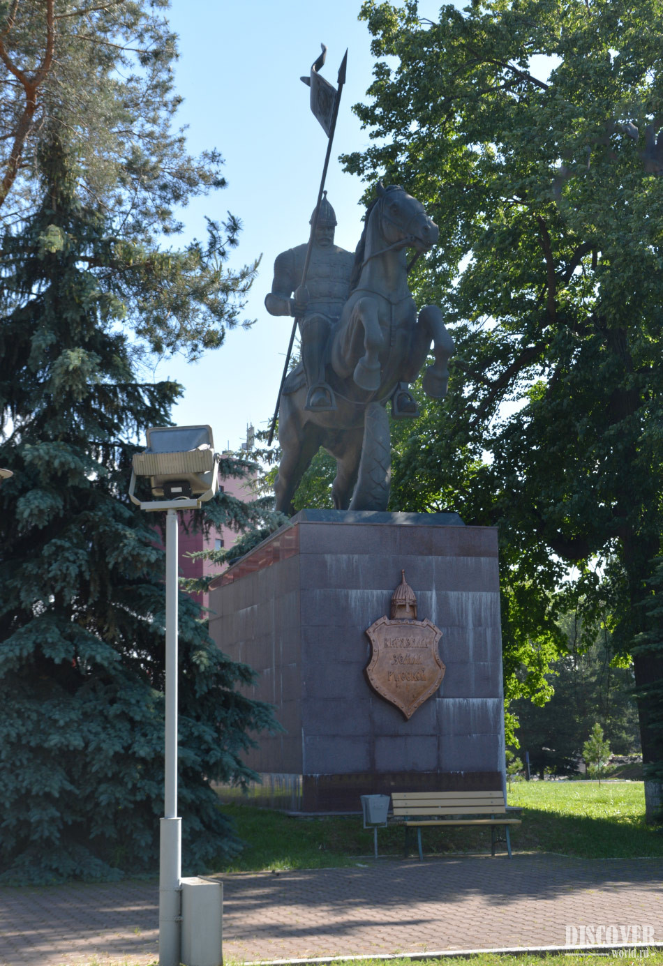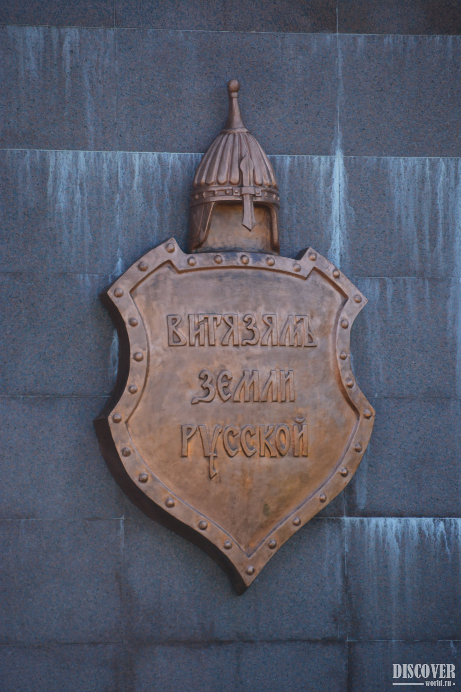 Памятник "Витязь" - это скульптура бронзового всадника, который сражается со змеем. На постаменте памятника изображен щит с надписью: