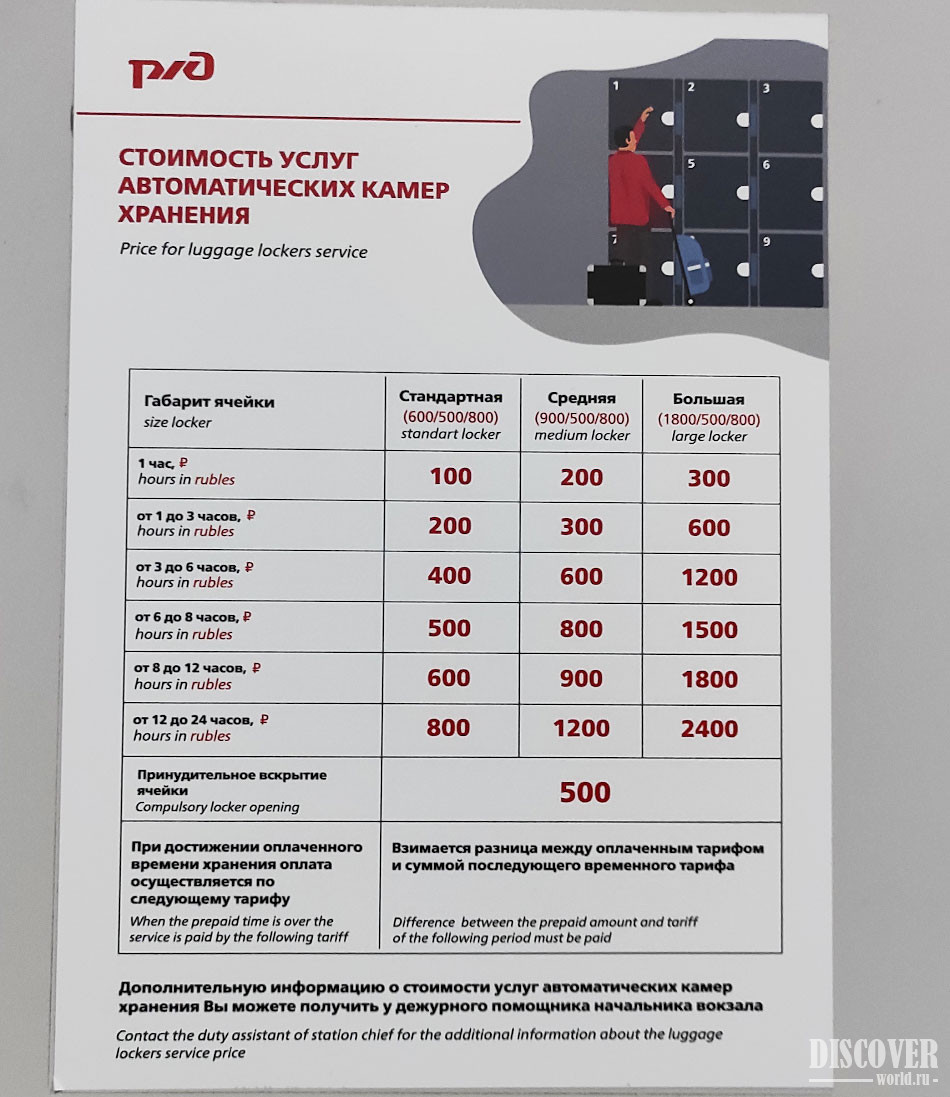 Цены на хранение багажа указаны за ячейку в рублях: