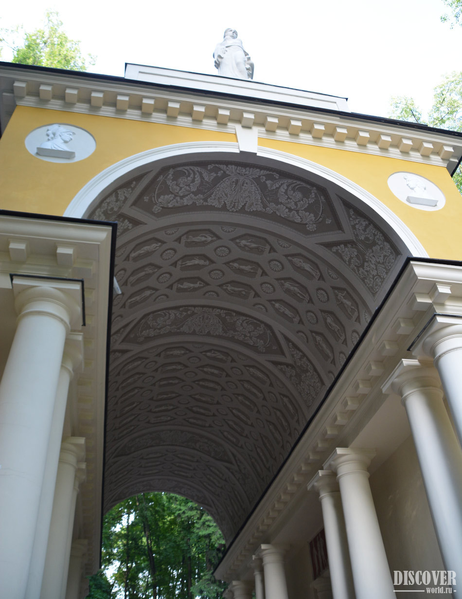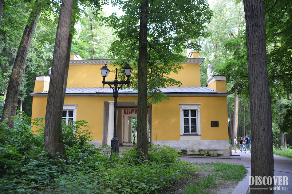 Здание строилось для отдыха посетителей. Вход украшали скульптуры дельфинов и сфинксов. Свод павильона был расписан с помощью техники, имитирующей лепной декор.