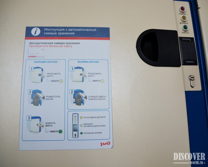 - Приложите карту к индикатору ячейки, дверь должна открыться. Если горит желтая лампочка время хранения истекло, необходимо доплатить за лишние часы.