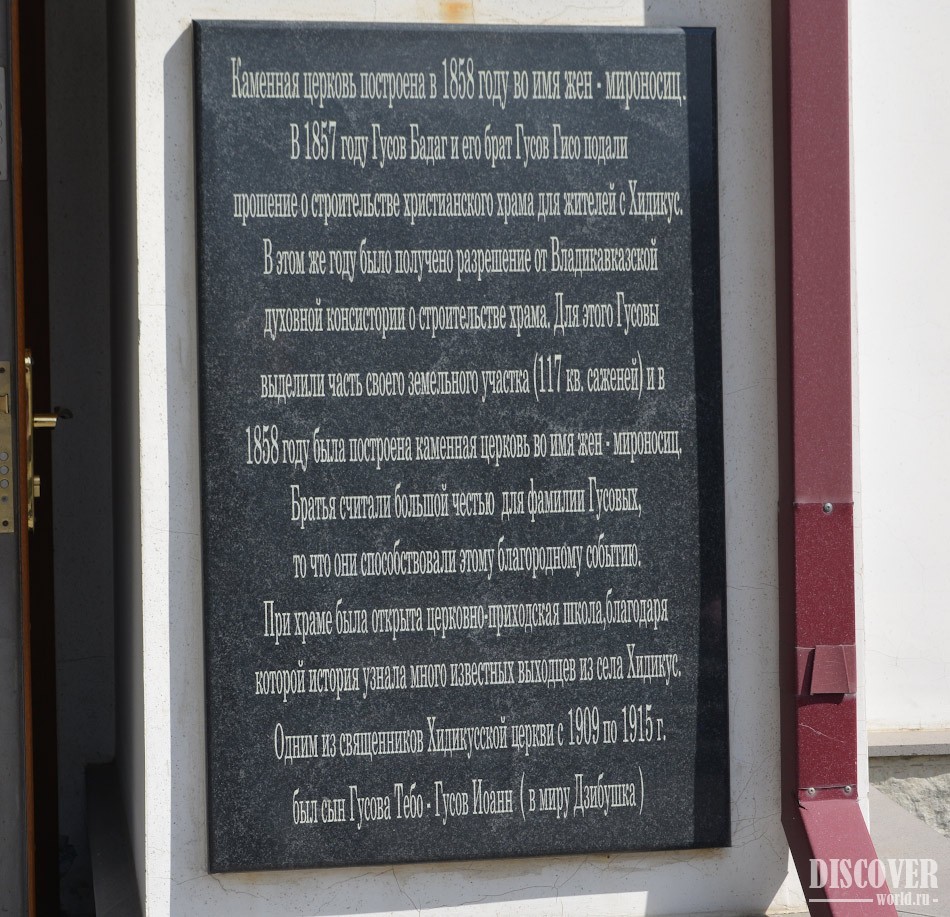 Церковь была построена в 1858 году. В 1857 году братья Гусовы подали прошение о строительстве храма для жителей села Хидикус. В этом же году Владикавказская духовная консистория одобрила эту идею. Для строительства церкви братья Гусовы выделили часть своего земельного участка (117 кв. саженей). Год спустя храм был уже готов, при нем была открыта церковно-приходская школа.