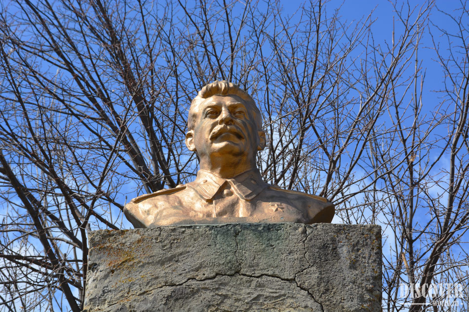 Бюст Сталина выкрашен в золотой цвет и помещен на высокий постамент.