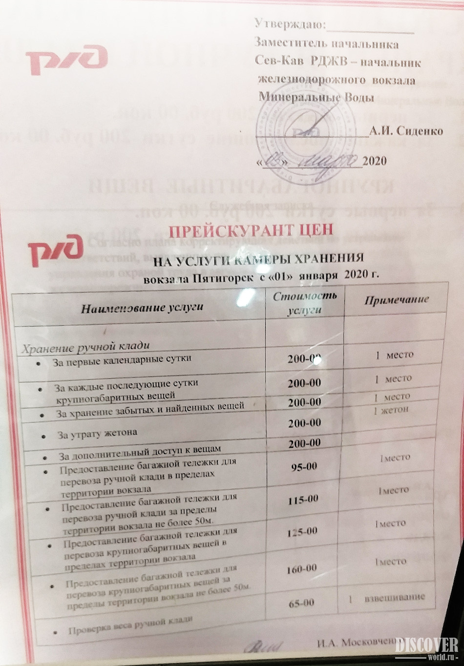Приехав в Пятигорск, у вас может возникнуть необходимость оставить на хранение свои вещи. На ж/д вокзале Пятигорска есть ручная камера хранения, где стоимость будет учитываться за каждую оставленную сумку поштучно.