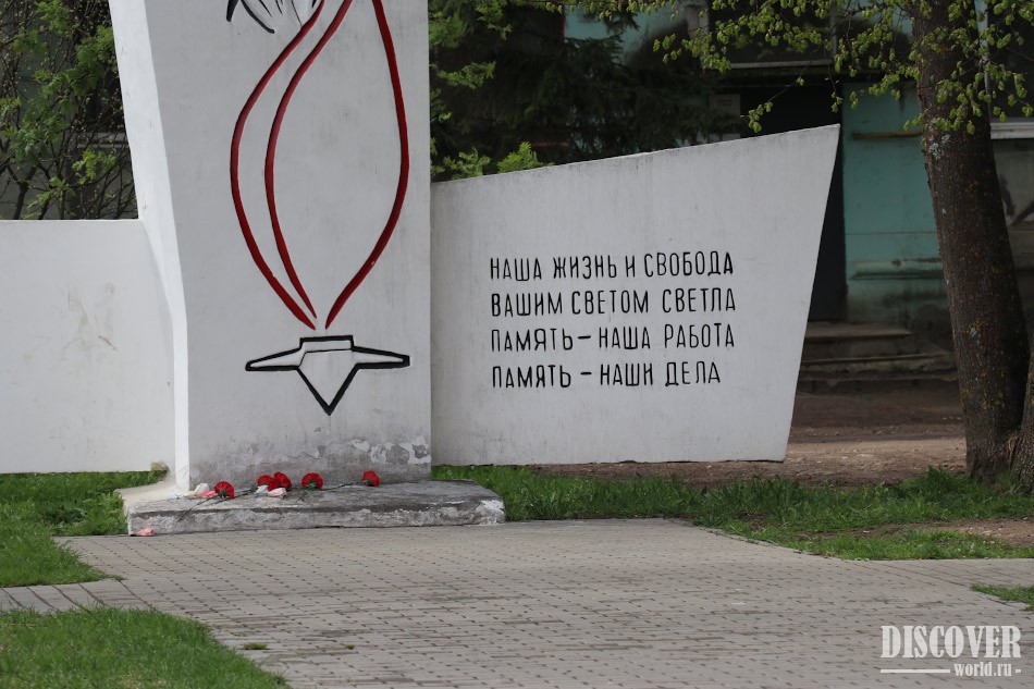На белом монументе изображен Вечный огонь и портрет пожилой женщины.