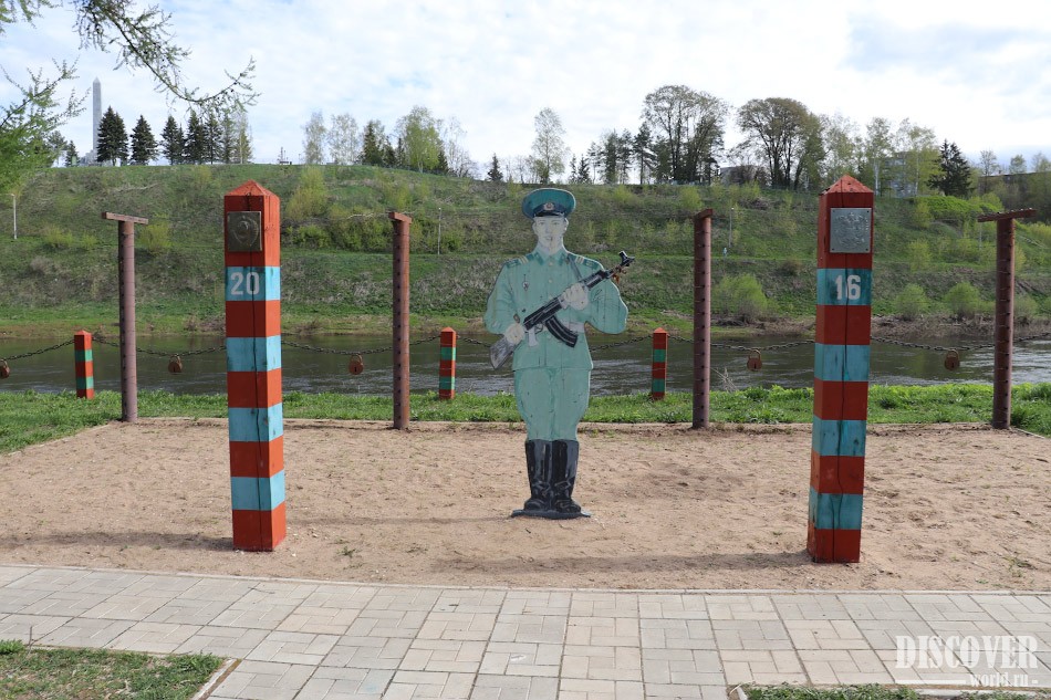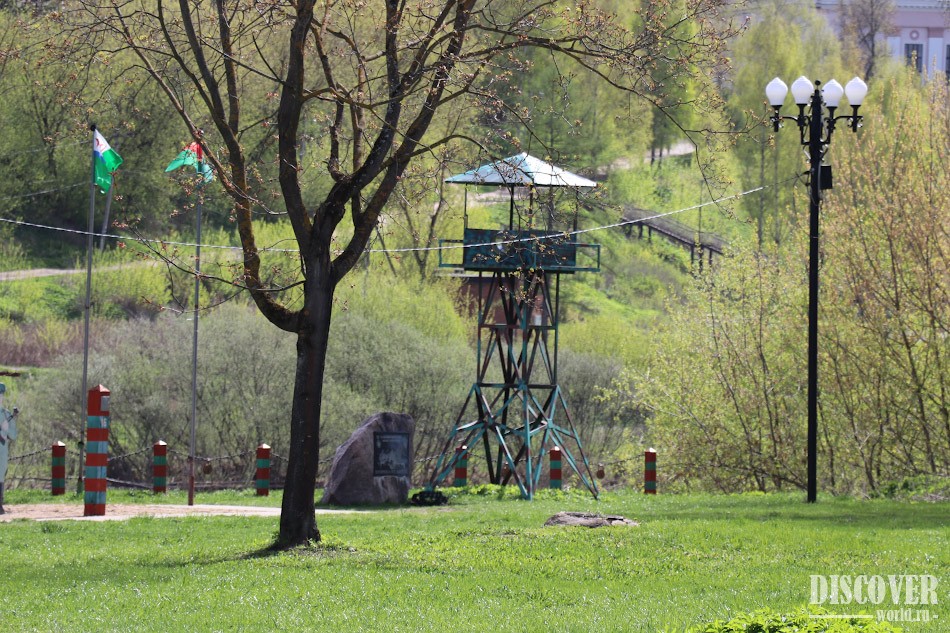 Рядом с памятником можно также увидеть дозорную вышку, стенд с информацией, а также скульптуру пограничника с верным спутником - собакой.