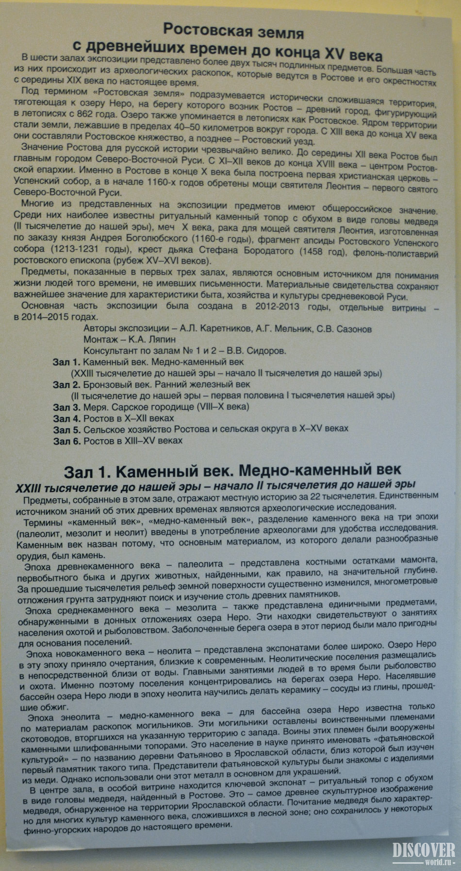 Экспозиция "Ростовская земля: с древнейших времен до конца XV века" посвящена археологическим находкам, рассказывающим об истории Ростовской земли.